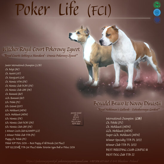 sire :MULTI BIS, BISS, GCH, CH, Junior Inter Champion, MULTI J.GCH WITCHER ROYAL COURT Pokerowy Zywot dam : Inter Champion, GCH, CH, MULTI J.GCH BENADEL BRAVO Iz Novoy Dinastii (RUSIA)